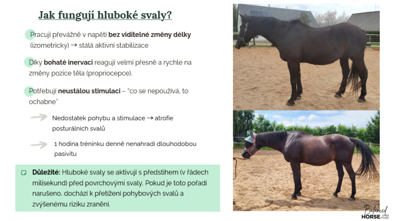 Tento kurz vás nebude učit „správné cviky“ ani univerzální recepty. Místo toho vám pomůže porozumět tomu, proč se tělo vašeho koně chová právě tak, jak se chová, a co vám jeho postura jemně, ale jasně sděluje o jeho pohodě a welfare.