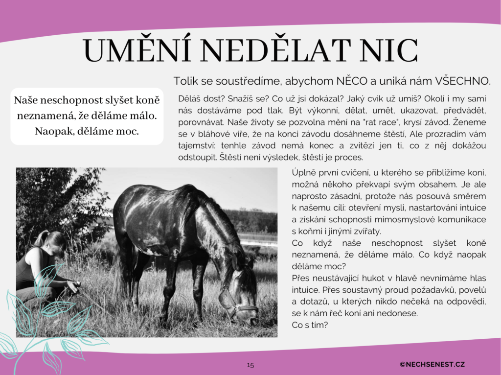 • Dost možná vám nestačí na koních jen jezdit. Asi cítíte, že pro nás mají daleko hlubší poselství. Co když dokážeme slyšet jejich hlas? Co když se s nimi můžeme spojit na duchovní úrovni?