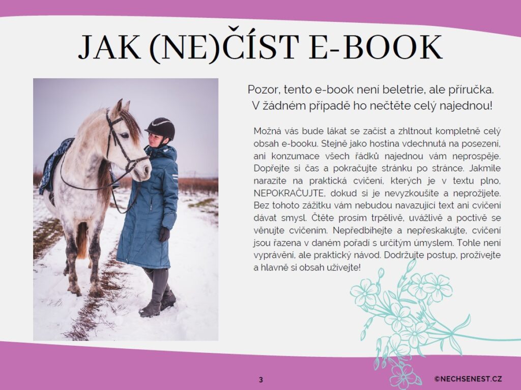 "Tento kurz jsem tvořila pro všechny, které okouzlili koně a rádi by se o nich dozvěděli co nejvíce. Všechny informace jsou ověřené, podložené letitými zkušenostmi a hlavně v souladu s welfare a nejlepšími zájmy koní. Pojďme společně vychovat novou generaci vzdělaných a ohleduplných jezdců."